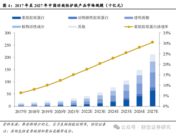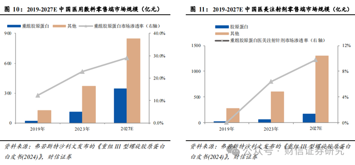 医美针剂方面:医美注射作为一种常见的非手术医美手段,因其安全性、恢复期短等优势广受消费者青睐。其中,重组胶原作为医美注射的三大生物活性成分之一,常用于填充与水光。一方面,当重组胶原在注射到凹陷性皮肤缺损后,不仅可以起到支撑填充的作用,还能激活自身组织重建,逐渐生成的新生组织将与周围正常皮肤共同协同实现局部矫形作用,因此常用来消除皱纹皱褶。另一方面,重组胶原蛋白还可以作为水光产品用来改善肌肤状态。胶原蛋白中大量的亲水性氨基酸,当其进入到真皮层后,可以提升皮肤的含水率,从而达到补水保湿的作用。此外,重组胶原蛋白还能激活细胞的新陈代谢,降低表层皮肤的色素沉淀,实现淡斑美白的效果。目前,由于重组胶原蛋白注射剂市场起步发展较晚、技术壁垒更高、消费者教育不充分,以及产品推广不足等问题,市场渗透率还处于相对较低的水平。据弗若斯特沙利文数据分析,2023年我国重组胶原蛋白医美注射剂零售端市场规模为43亿元,市场渗透率仅为6.4%。后续随着市场认可度不断提升,重组胶原蛋白医美针剂市场份额也将进一步提升。据弗若斯特沙利文数据预测,2027年,我国重组胶原蛋白医美注射针剂零售端市场规模将达到143亿元,在医美注射针剂零售市场份额将增长至9.8%。