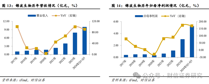 公司围绕生命健康新材料和抗病毒领域,打造国家级“专精特新”小巨人企业。锦波生物成立于2008年,是一家应用结构生物学、蛋白质理性设计等前沿技术,围绕生命健康新材料和抗病毒领域,系统性从事功能蛋白基础研究,并运用合成生物学等方法实现功能蛋白的规模化生产的高新技术企业,同时也是国家级“专精特新”小巨人企业。目前,公司主营业务为以重组胶原蛋白产品和抗HPV生物蛋白产品为核心的各类医疗器械、功能性护肤品的研发、生产及销售,并建立了从上游功能蛋白核心原料到医疗器械、功能性护肤品等终端产品的全产业链业务体系。2018-2023年,公司营收由1.28亿元提升至7.8亿元,2018-2023年复合增长率为40.14%;归母净利润由0.44亿元提升至3亿元,2018-2023年复合增长率为43.33%。2024年前三季度,公司实现营收9.88亿元,同比增长91.16%;归母净利润5.20亿元,同比增长170.42%;扣非归母净利润5.11亿元,同比增长178.14%。