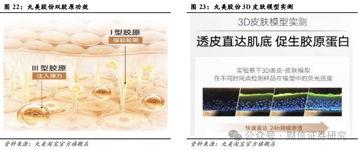 科研实力雄厚,双胶原蛋白核心优势显著。目前,公司已经构建了基础研究中心、中试实验中心、应用开发中心、医学检测中心、技术支持中心、开放创新中心六大研发平台,实现了“基础研究-原料开发-原料生产-配方研究-生产智造-检验检测-功效评测”七位一体全链路协同创新模式构建,积淀了深厚的科技实力。截至2024年中期,公司累计获得授权专利318项,其中获得授权发明专利210项;公司围绕创新原料与技术,发表高水平论文7篇,主导或参与10项标准制订,其中《化妆品行业绿色工厂评价规范》《护肤品产品碳足迹评价导则》《化妆品原料重组可溶性胶原蛋白》等团体标准均已成功发布实施。重组胶原方面,2021年,公司发布了与人体自身胶原蛋白的功能结构域氨基酸序列100%一致“重组人源化胶原蛋白”,并展现了多重优势:1)公司通过 “翻译暂停”专利技术对基因序列和蛋白活性进行优化,实现了更高效的活性胶原蛋白表达;2)公司的重组双胶原蛋白与天然胶原蛋白呈现出高度相似的三螺旋结构,以1:1配比嵌合I型和III型胶原蛋白,具备更稳定、更安全,更有活性的特点,且分子量超小为27.3KD,更容易透皮吸收;3)“C-PRO扣环加固技术”+羟基化酶专利,提升稳定性,加强了皮肤支撑性。2024年,公司加强了重组功能蛋白规模化产线建设,实现包括重组双胶原2.0和重组弹性蛋白等核心活性蛋白原料的高效表达和产品应用。