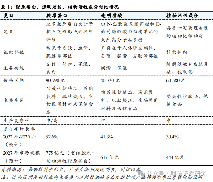 相比透明质酸、植物活性成分,胶原蛋白在抗衰和皮肤修复方面更具备优势。在美容护理市场中,透明质酸、植物活性成分、胶原蛋白三大生物活性成分均有较高的市场认可和广泛应用。其中,透明质酸作为一种天然存在于人体皮肤组织中的保湿因子,以其独特的黏弹性和卓越的保水性著称。它能深层渗透肌肤,为细胞提供充足的水分,有效缓解肌肤干燥、细纹等问题;植物活性成分则是从各种天然植物,如熊果苷、人参皂苷、绿茶提取物、马齿苋提取物、青刺果提取物、芦荟提取液等中提取的具有生物活性的物质,种类繁多,且具有不同的功效,常用于缓解皮肤过敏和炎症,以及提供抗氧化等。而作为人体含量最多的蛋白质,胶原蛋白不仅能够为皮肤提供结构支撑,促进止血及细胞黏附,还能刺激细胞再生及增殖,有效修复受损皮肤屏障。尤其重要的是,它能够针对老化及问题皮肤提供必要营养,使肌肤重焕活力与新生。因此,胶原蛋白在医学敷料、再生医学、创伤修复、以及人造器官等领域中展现出了更为广阔的应用前景。