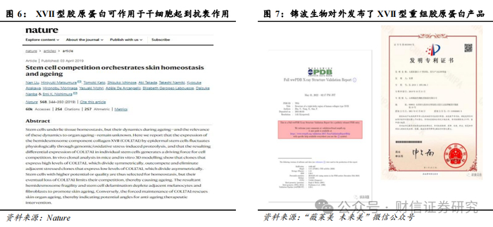 另外,随着成熟胶原蛋白产品不断迭代,以及新型重组胶原蛋白产品加速突破,重组胶原蛋白应用领域也在持续扩大。现阶段,重组胶原蛋白主要应用于功能性护肤品和Ⅱ类医疗器械领域,在III类重组胶原蛋白方面,仅有锦波生物一家获批。此外,除了较为成熟的III型重组胶原蛋白外,众多胶原蛋白厂商还在积极探索其他类型的胶原蛋白。其中,锦波生物、创建医疗、巨子生物先后均布局了XVⅡ型重组胶原蛋白。作为一种新型治疗用蛋白质和抗衰老成分,XVII型胶原蛋在皮肤衰老、脱发、白发、创伤修复中能发挥着至关重要的调节作用。目前,珀莱雅旗下子品牌Off&Relax已推出了首款应用XVⅡ型胶原蛋白育发技术的防脱发产品,远想生物旗下品牌伊肤泉也推出了全国首款Ⅱ类械XVII型胶原-伊肤泉胶原小17,主打面部抗衰。