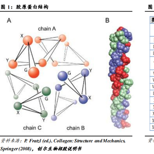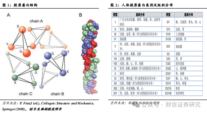 胶原蛋白是人体主要的细胞外基质(ECM),约占细胞外基质85%,是人体组织器官的主要结构蛋白,约占人体蛋白质总量的30%~40%,主要存在于皮肤、血管、肌腱、筋膜等部位,全方位参与人体组织器官的修复和再生。胶原蛋白由原胶原组成,每个原胶原都由3条α-螺旋的肽链缠绕而成,具有典型的三螺旋结构,众多胶原蛋白大分子又相互交织形成胶原蛋白纤维,因此其具有柔韧性和较大的抗拉强度。此外,胶原蛋白还具有生物降解性、低免疫原性、生物相容性、以及促进细胞增长等生物特性。