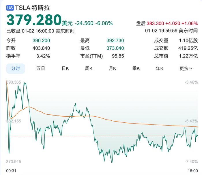 受交付数据低于预期影响,特斯拉美股开盘一路下跌,最终收盘跌幅为6.08%,市值蒸发788亿美元(约合人民币5770.5 亿元)。