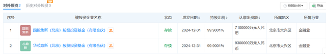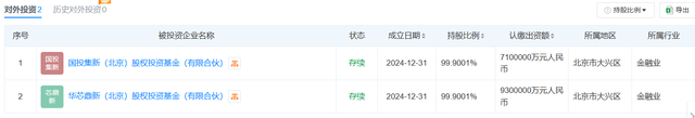 其中华芯鼎新(北京)股权投资基金(有限合伙)成立于2024年12月31日,国家大基金三期投资930亿元,持股比例99.9001%。另一位出资方为华芯投资管理有限责任公司(以下简称“华芯投资”),投资9300万元,持股比例0.0999%,是该有限合伙企业的实际控制人。