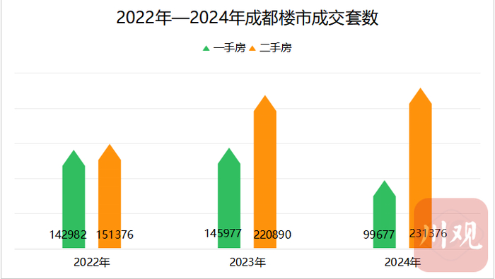 虽然相比2023年商品房市场全年成交超36万套略有下滑,但成都楼市的总成交量在全国范围内依然数一数二。尤其是二手房成交逆势上涨,屡破纪录,创下新高。