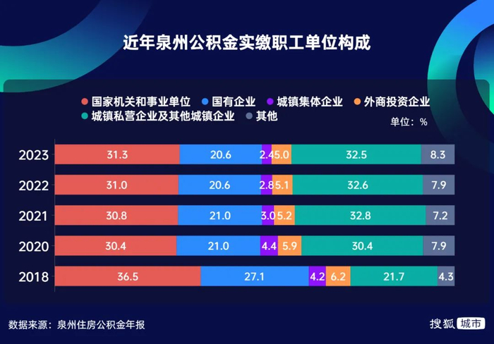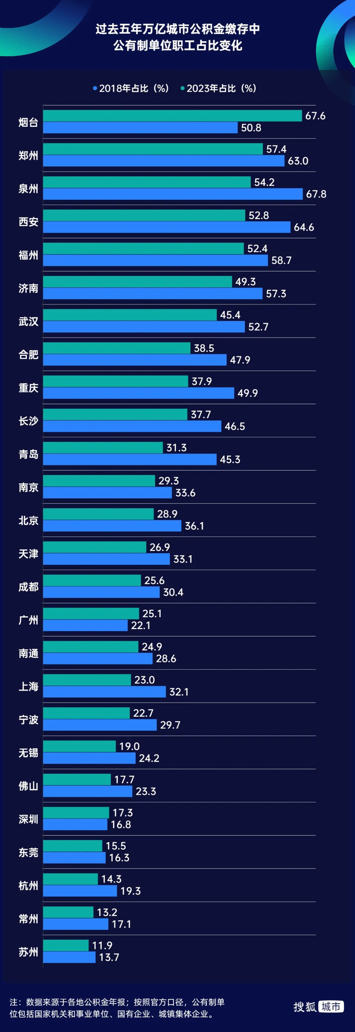 泉州888.3万的常住人口,公积金实缴职工仅有65.8万,在万亿城市中垫底;其中来自公有制单位的职工占比过半,外资、城镇私营等体制外企业参与比例较低。
