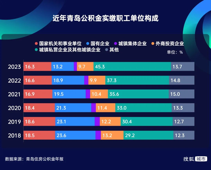 近年青岛不断优化营商环境,民营经济持续壮大,贡献着全市60%以上的税收、近70%的进出口、80%以上的城镇新增就业、90%以上的经营主体和企业数量,在促进创新、增加就业方面作用显著。城镇私企职工缴纳公积金占比稳步提高,助力青岛“体制内强度”持续下降。