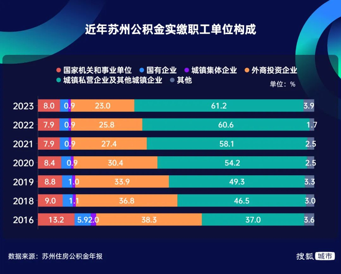 近年随着全球产业链转移、沿海企业外迁,以及民营经济发展、公积金制度完善,苏州公积金实缴职工中,外资企业占比持续下滑,五年降幅超1/3;城镇私企及其他城镇企业占比则不断提升,五年升幅超1/3,完成了地位的转换。