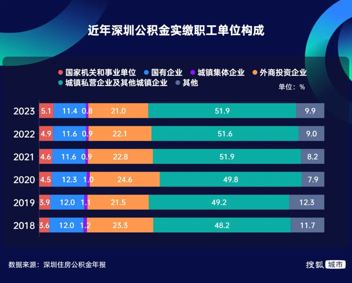 深圳的城镇私营企业及其他城镇企业,一直占据公积金实缴职工的半壁江山。外企实缴职工占比也相对稳定,一直在20%-25%之间。深圳“体制内强度”之所以高于苏州,主要在于其拥有更多的国有企业,体制内整体实力更高、缴费职工更多。