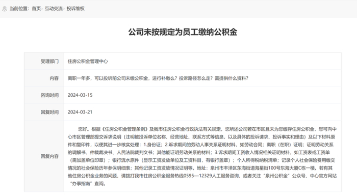 2024年3月,泉州一离职员工在住房公积金管理中心的投诉。