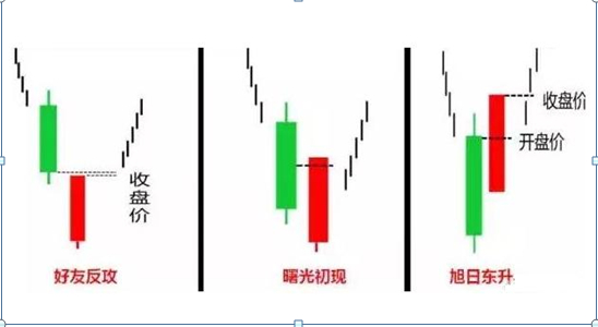 好友反攻、曙光初现、旭日东升K线形态相似,因此放在一起。三者反转信号逐个提高,在连续下行之后,出现此信号千万要注意。