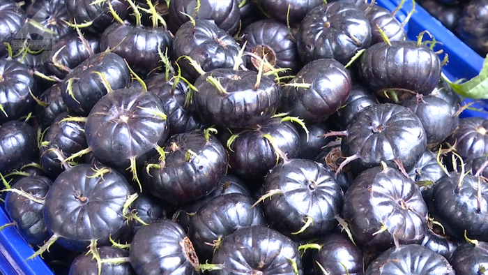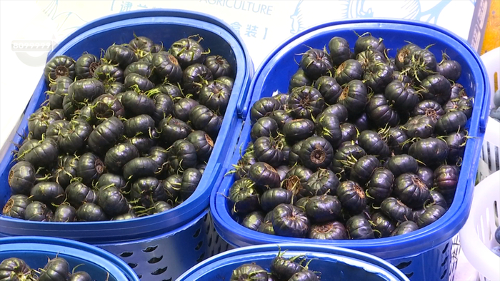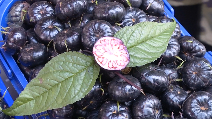 商户说:“这是一种新型的水果,它的花青素很丰富,它含有丰富的花青素、黄酮、膳食纤维,叫红果参,是一种野生水果培育出来的,产量也高、销量也大,主要销往外省,每天要走几吨。”