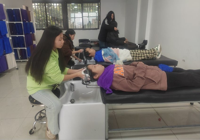 冬日清晨,在毕节市财贸学校美发实训室里,同学们正在上课。“吹风、造型、洗发、理发,每天学生都有两节实训课。”北京人生剪艺投资咨询有限公司派到学校的任课老师胡显说,学生在学校学完2年后,可以自主选择去公司实习1年。“实习期3000元底薪,多劳多得,还提供住宿。”胡显说。