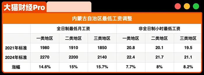 比如内蒙古,最低月工资标准都提高到了2100元+,涨幅平均15%,非全日制小时最低工资21+,平均涨幅8%,和不少发达省份齐平。