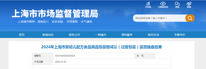 2024年上海市婴幼儿配方食品商品包装物减量(过度包装)监督抽查结果