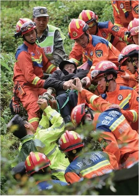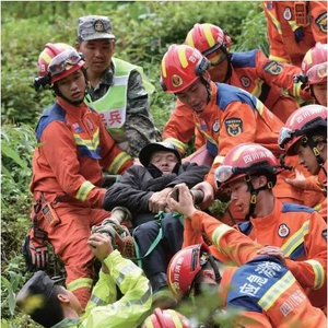 “没有路,我们就是路”——2024年7月21日,四川省雅安市汉源县发生山洪泥石流灾害,现场沟深坡陡,道路损毁严重,雅安消防救援支队接力转运行动不便的老人。