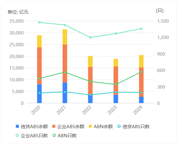 截至12月31日,2024年度ABS存量规模约3.3万亿元,同比去年减少约2.3%,存量持续下降,且较去年降幅扩大。