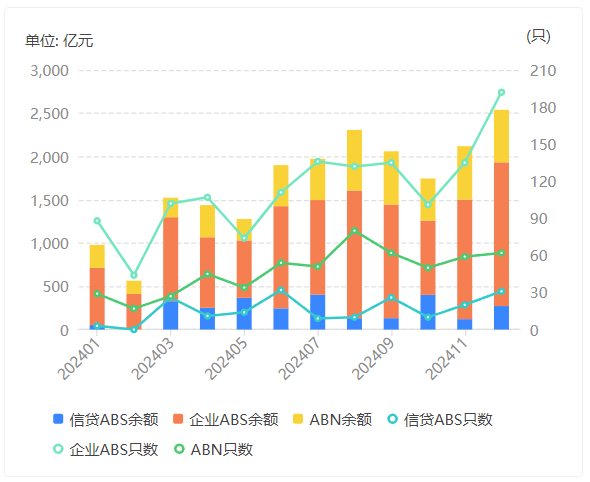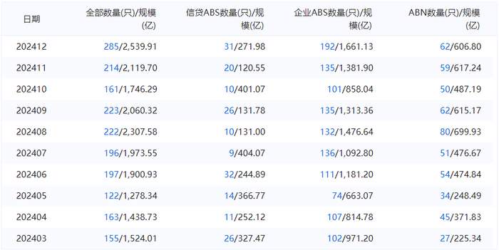 2024年发行逐月来看,ABS发行规模逐渐增加,从年初1000亿以下,增至12月的发行超2400亿。
