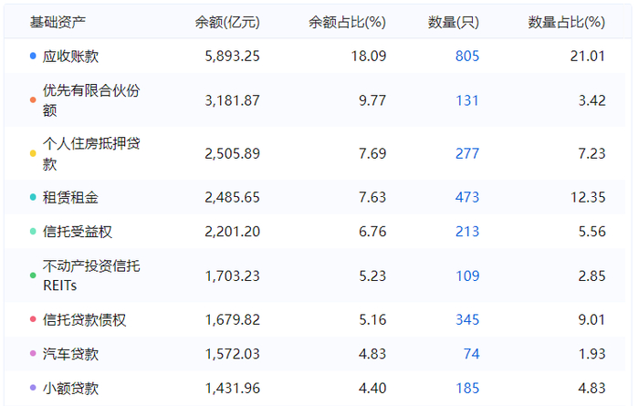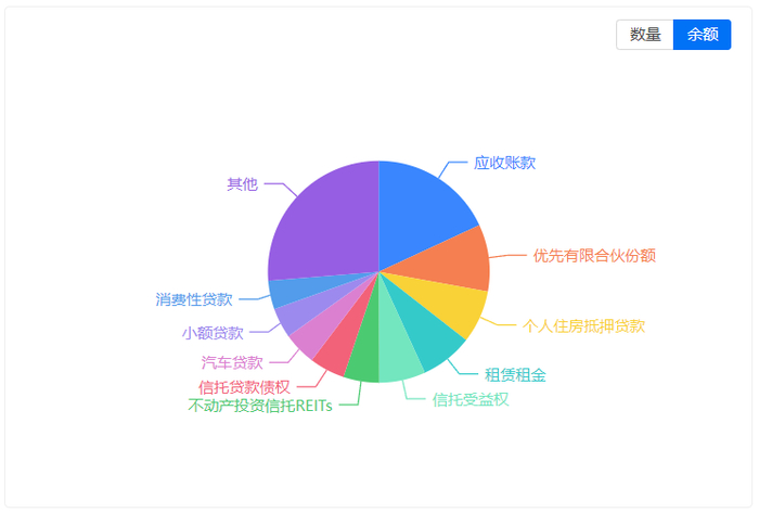 从存量统计数据来看,存量最多的应收账款余额在6000亿以下,较去年有所减少,2024年占比仍接近20%;另外租赁租金ABS数量有473只占比达12.35%,维持去年较大占比(以下显示余额千亿以上的基础资产情况,完整数据可在企业预警通网页版或APP【ABS专题】查看)