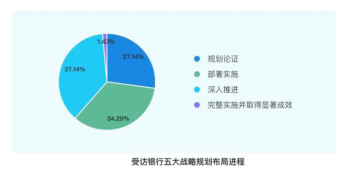 与金融“五篇大文章”中发力点和优化方向相同,中小银行围绕国家战略,探索将数字金融与科技金融、绿色金融、养老金融、普惠金融等重要战略结合,服务国家重大战略和金融体制改革进程。《报告》调查发现,有1.43%的受访银行已经完整实施并取得显著成效,27.14%的受访银行处于规划论证阶段,34.29%的受访银行开始部署实施,37.14%的受访银行处于深入推进阶段,金融服务实体经济高质量发展、深化金融供给侧结构性改革进程不断加速。