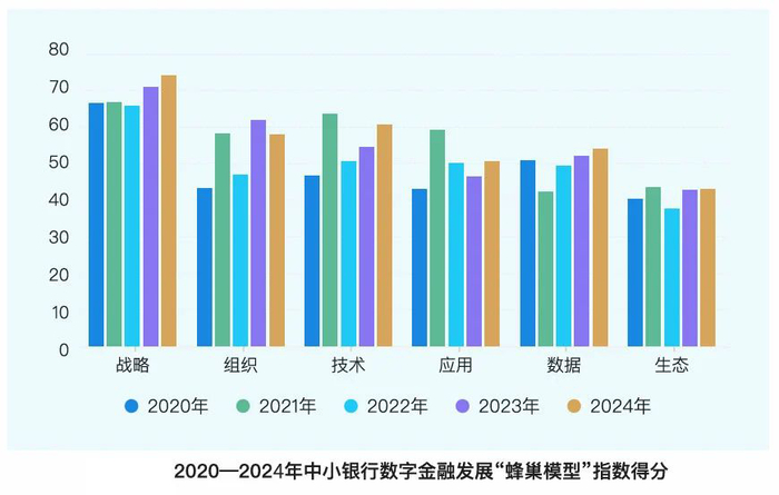 与2023年相比,2024年中小银行在战略、技术、应用、数据、生态五个维度得分均有所上升。尤其是技术维度得分持续提高,表明中小银行金融科技投入规模稳步增长,越来越多的中小银行信息技术创新和自主可控能力处于推广应用阶段,将核心技术研发及新技术金融应用纳入规划,并进行相关产品研发。同时,需要注意的是2024年中小银行组织维度得分较2023年有所下降,反映了数字金融人才队伍缺乏的现状。
