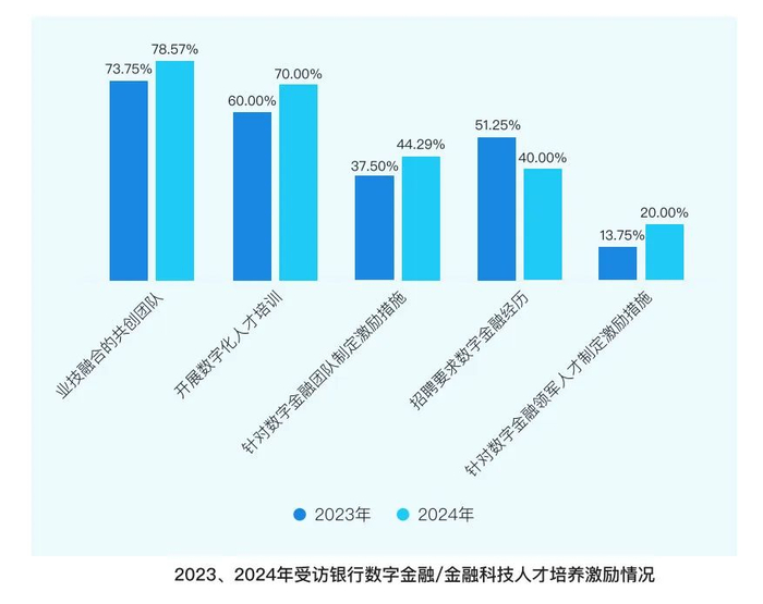 与数字金融战略相匹配的组织架构调整加速,优化、整合成为高频词。《报告》显示,55.71%的受访银行优化高级管理层、成立数字金融委员会,11.43%的受访银行设立科技子公司,37.14%的受访银行整合行内一级科技部门,将信息科技部整合为数字金融部。有78.57%的受访银行组建了不同业务条线、业务与技术条线相融合的共创团队,相较去年(73.75%)呈现稳步增长态势。70%的受访银行在全行范围内开展数字化人才培训,非技术人员也被纳入数字化能力培养体系。
