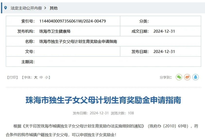 近日,珠海市卫生健康局发布《珠海市独生子女父母计划生育奖励金申请指南》,提醒符合条件的市民申领独生子女奖励金。