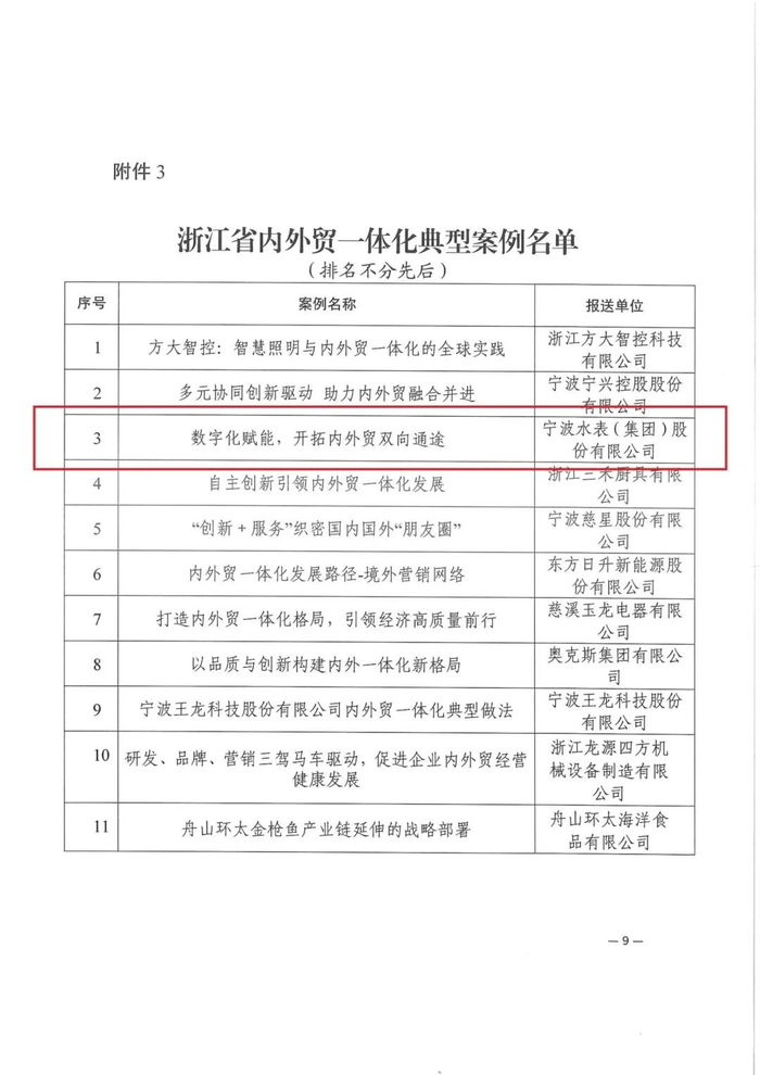 近日,浙江省商务厅公布了浙江省内外贸一体化典型案例名单,宁波水表(集团)股份有限公司《数字化赋能,开拓内外贸双向通途》案例成功入选。
