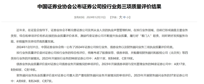 2024年12月31日,中国证券业协会(以下简称“中证协”)统一公布了2024年证券公司投行业务、债券业务以及财务顾问业务三项执业质量评价结果。