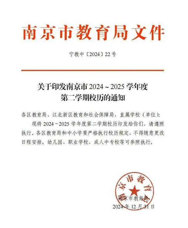 南京市2024-2025学年度第二学期校历发布