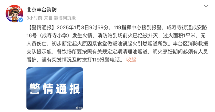 据@北京丰台消防 ,2025年1月3日9时59分,119指挥中心接到报警,成寿寺街道成安路16号(成寿寺小学)发生火情,消防站到场前火已经被扑灭,过火面积1平米,无人员伤亡,初步断定起火原因系食堂做饭油锅起火引燃烟道所致。