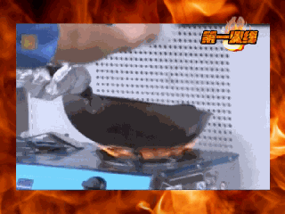 放慢速度可以看到,当油锅起火一瞬间,窜出的火迅速蹿升到油烟机内,很快被火映得通红。幸好灭火器就在手边,不然后果不堪设想。