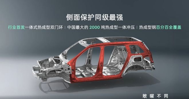 安全方面,新架构行业首发一体式热成型双门环,中国最大的 2000 吨热成型一体冲压,热成型钢百分百全覆盖,柱碰标准超行业 16 倍,全球首个后碰标准达 100km/h 的 SUV。