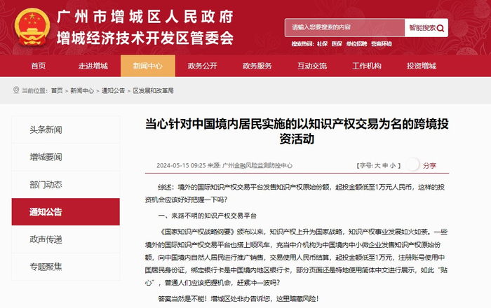 比如,2024年5月,广州市增城区政府转发广州金融风险监测防控中心的文章称,一些境外的国际知识产权交易平台充当中介机构为中国境内中小微企业发售知识产权原始份额,向中国境内自然人居民进行推广销售,交易使用人民币结算,起投金额低至1万元,注册账号使用中国居民身份证,绑定银行卡是中国境内地区银行卡,部分页面还是特地使用简体中文进行展示。