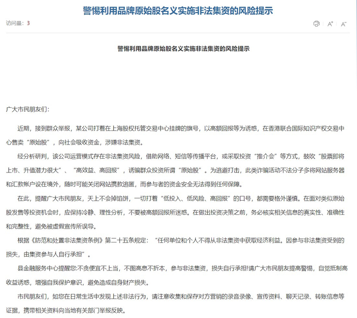 2024年11月,宁都县金融服务中心发文提示,近期接到群众举报,某公司打着在上海股权托管交易中心挂牌的旗号,以高额回报等为诱惑,在香港联合国际知识产权交易中心售卖“原始股”,向社会吸收资金,涉嫌非法集资。经分析研判,该公司运营模式存在非法集资风险,借助网络、短信等传播平台,或采取投资“推介会”等方式,鼓吹“股票即将上市、升值潜力很大”“高效益、高回报”,诱骗群众投资所谓“原始股”。为逃避打击,此类诈骗活动不法分子多将网站服务器和汇款账户设在境外,随时可能关闭网站携款逃匿,而参与者的资金安全无法得到任何保障。