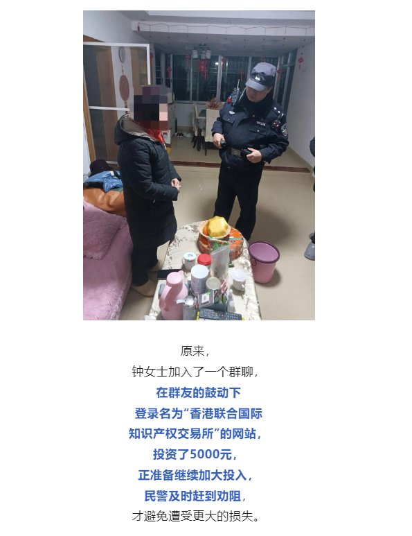 比如,2024年3月,微信公众号“韶关民声”就发布一文章称,钟女士加入了一个群聊,在群友的鼓动下登录名为“香港联合国际知识产权交易所”的网站,投资了5000元,正准备继续加大投入,民警及时赶到劝阻,才避免遭受更大的损失。