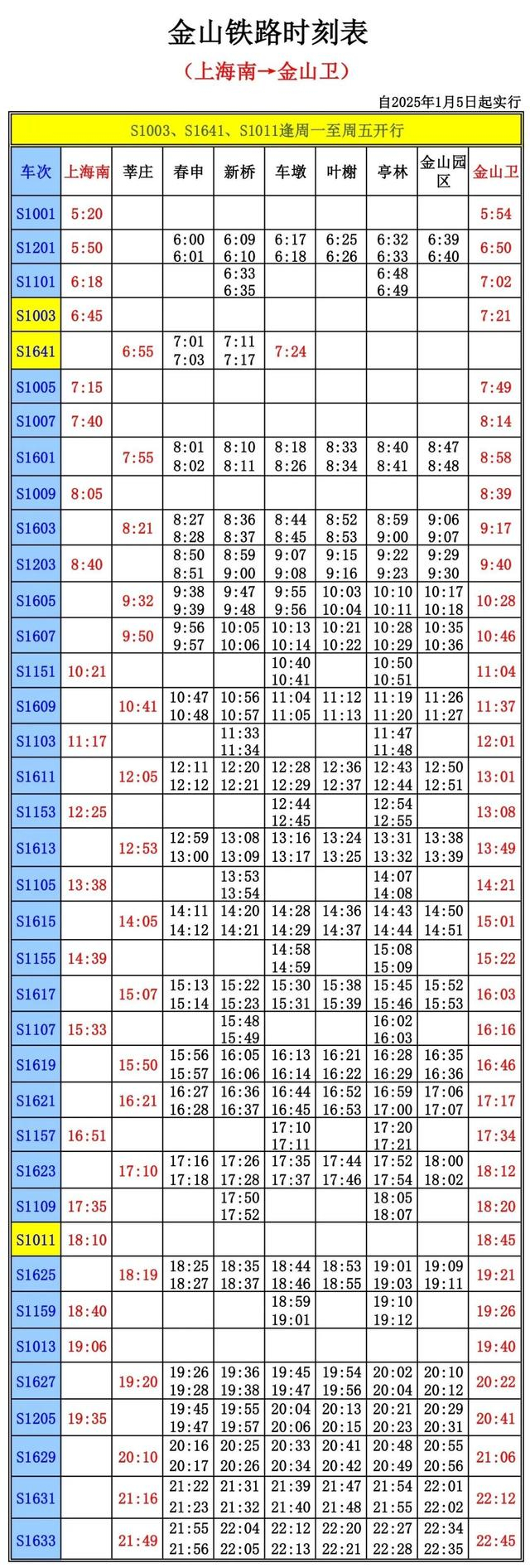 根据最新安排,2025年1月5日起,金山铁路调整运行图。此次调图变化较大,请旅客们相互转告,提前做好行程安排。