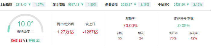 沪指跌1.57%逼近3200点、创指跌2.16%创阶段新低 微盘股指数跌近5% 全市场超4700股飘绿、超百股跌停.指数高开低走,午后加速下挫,创业板指跌超2%创去年10月8日以来调整新低,沪指跌超1.5%来到3200点附近。截至收盘,沪指跌1.57%,深证成指跌1.89%,创业板指跌2.16%,微盘股指数跌近5%。两市个股跌多涨少,下跌个股超4700只,逾百股跌停;两市全天成交1.27万亿元,较上一日缩量成交1287亿元,内资主力资金净流出630.2亿元;两市涨跌中位数为-3.68%。