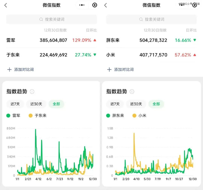 新抖数据显示,2024年,于东来的抖音账号“胖东来于东来”累计涨粉210万,胖东来的抖音官方账号“胖东来专营店”累计涨粉957万。微信指数显示,2024年的不少时间里,于东来和胖东来的指数趋势都超过了雷军和小米。