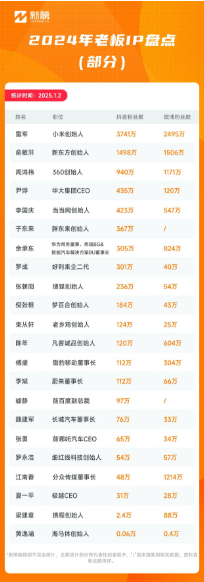 回过头看,相比2024年年初的饱受争议,随着雷军这个超级标杆,以及于东来、周鸿祎等大批成功案例的出现,再加上IP培训等配套服务的兴起,老板IP变得愈发火热。