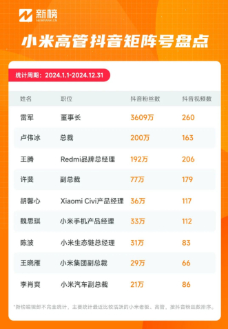 有了雷军打样,卢伟冰、王腾等小米高管纷纷跟进,在抖音组成了“小米高管天团”。目前小米高管在抖音的累计粉丝数达4228万。