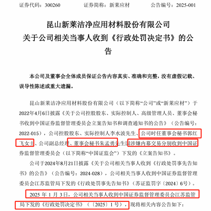 2025年首罚:新莱应材董秘证代一起“内幕交易”被罚没合计524万元