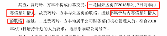 而且财务部门工作人员方丰、贾巧玲在内幕信息敏感期内与内幕信息的知情人朱孟勇存在联络、接触,且上述联络、接触时点与内幕信息的进程基本一致,也归为内幕信息知情人。