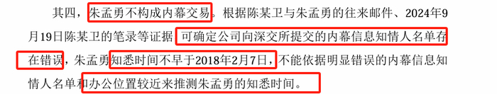 时任证代朱孟勇也进行了申辩,核心两点:一是之前提交的内幕信息知情人名单错误;二是离董秘办公位置坐得近也不一定就能知悉内幕信息。