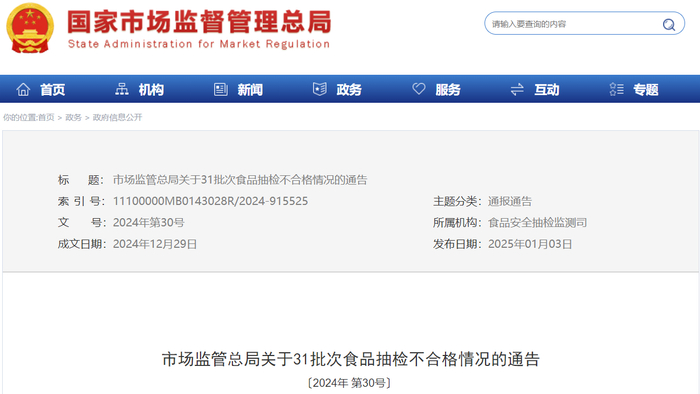 市场监管总局关于31批次食品抽检不合格情况的通告