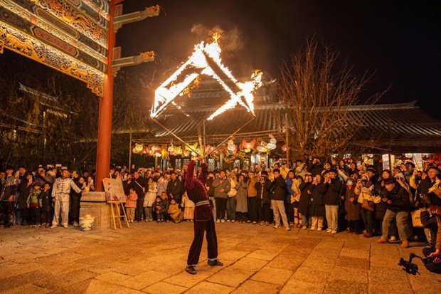 跨年活动,非遗民俗大赏精彩纷呈,传统民俗表演与现代科技文化完美融合,共同呈现出一场视觉盛宴。凤凰翱翔在清照泉城的上空,宛如天降祥瑞,为每一位到访的游客带去吉祥与美好的祝愿;龙蛇飞舞游天街,以火为墨,以夜空为卷,绘制出一幅动人心魄的光影图腾;火魔方在演员周围快速穿梭,每一次跳跃与翻转都伴随着火花四溅,仿佛火魔方在他们的手中被赋予了生命,不断绽放出耀眼的光芒,将新年的能量传递给在场的每一位游客。传统与现代完美融合的表演,不仅为游客们带来了丰富多彩的文化体验,更展现了清照泉城对传统文化的传承与创新。
