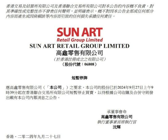 早在去年 9 月底,大润发母公司高鑫零售就发布了公告停牌,以待根据公司收购及合并守则发出载有公司内幕消息的公告。