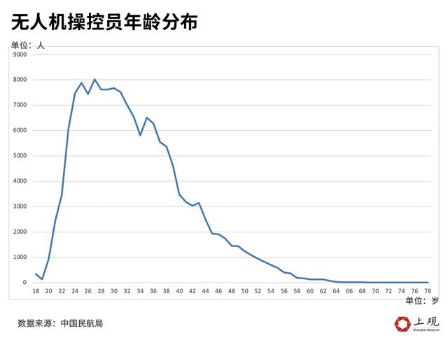 截至2023年统计范围内,我国最小的无人机驾驶员年龄是18岁,有332人(部分证件年龄限制为16岁)。大于70岁的驾驶员共有22人,年龄最大的驾驶员则已达78岁,仅1人。23-33岁共有8万余人。27岁的驾驶员最多,有8013人。