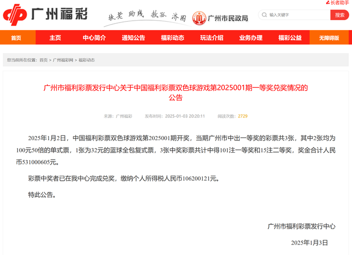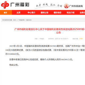 据广州福彩网,1月3日,广州市福利彩票发行中心发布公告称: