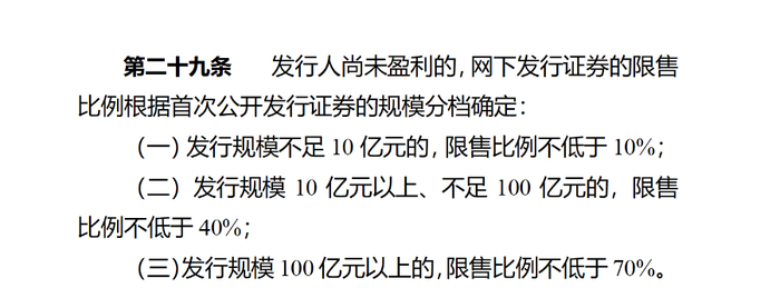 第二十五条 首次公开发行证券采用询价方式在主板上市,公开发行后总股本在4亿股(份)以下的,网下初始发行比例不低于本次公开发行证券数量的60%;公开发行后总股本超过4亿股(份)的,网下初始发行比例不低于本次公开发行证券数量的70%。